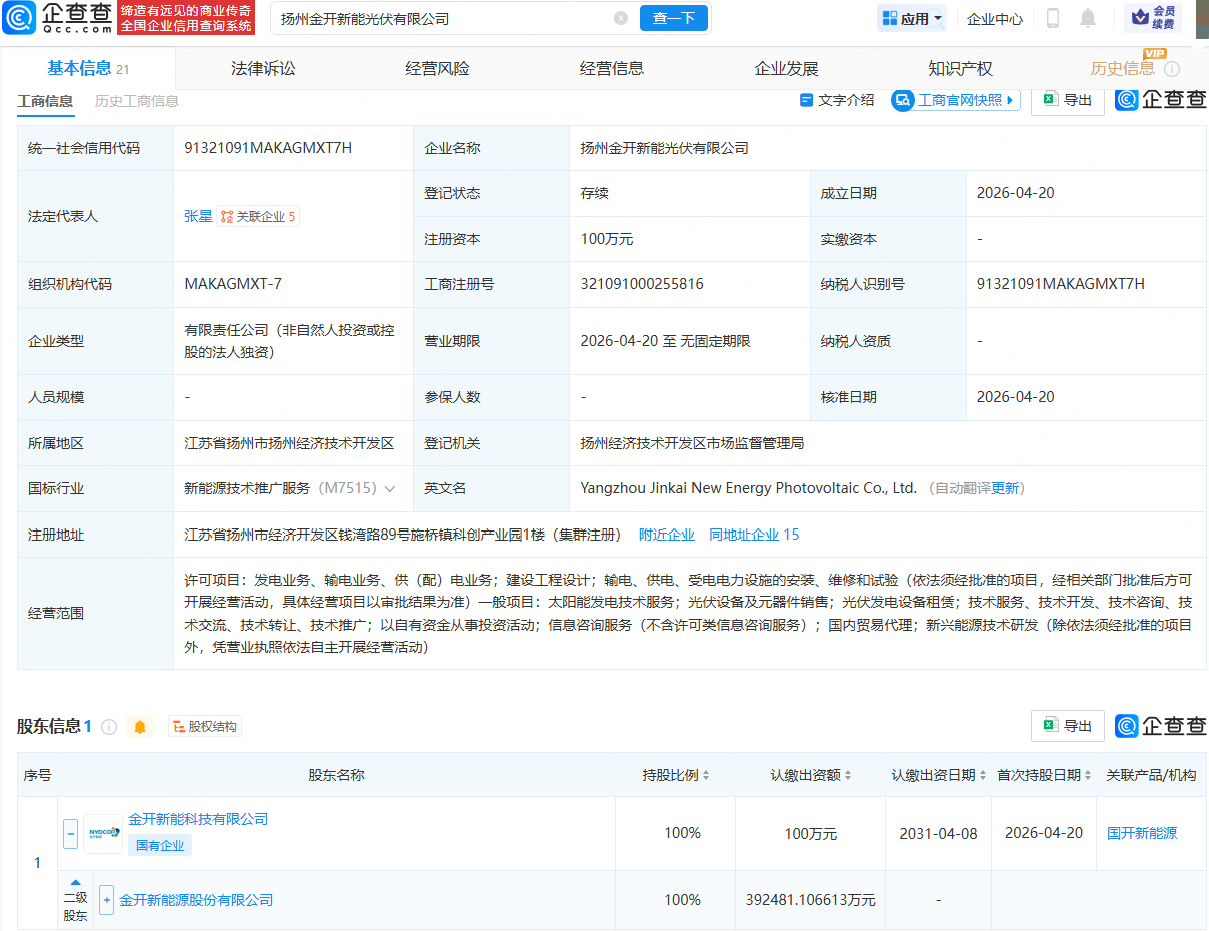 近日,扬州金开新能光伏有限公司成立,法定代表人为张星,经营范围包含:发电业务、输电业务、供(配)电业务;太阳能发电技术服务;光伏设备及元器件销售等。企查查股权穿透显示,该公司由金开新能(600821)间接全资持股。